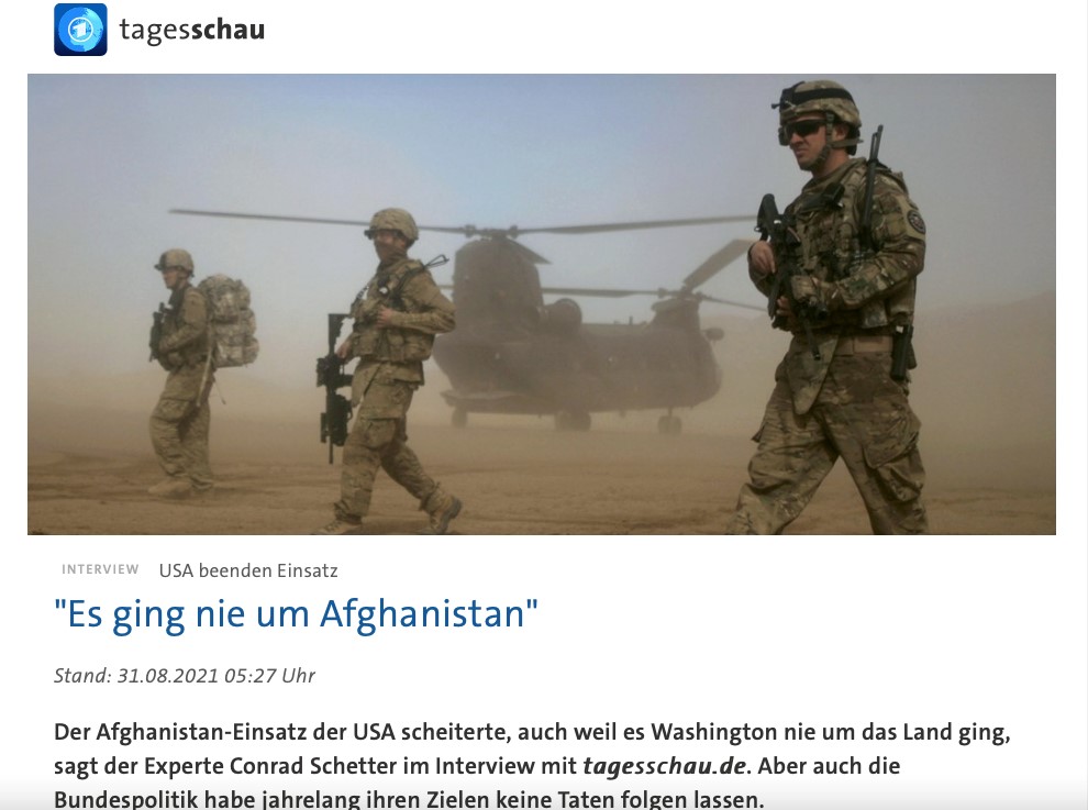 当地时间31日,德国电视一台《每日新闻》网站就阿富汗问题发表了专访文章。德国波恩国际军工转产中心(BICC)研究主任康拉德·谢特在采访中表示,美国在阿富汗的行动之所以会失败,是因为“美国从未真正关心过阿富汗。”