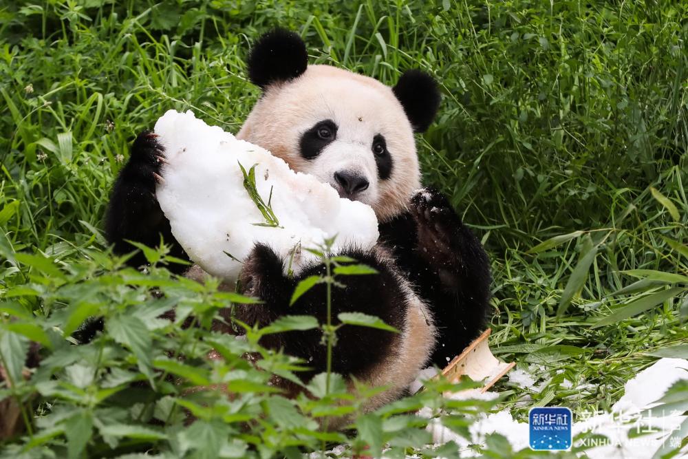 ↑8月31日,大熊猫幼崽“梦想”在德国柏林动物园享用“生日蛋糕”上的冰块。