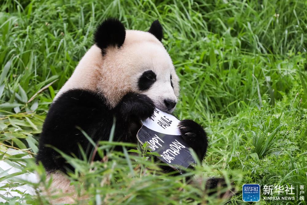 ↑8月31日,大熊猫幼崽“梦圆”在德国柏林动物园叼起“生日蛋糕”上的祝福卡片。