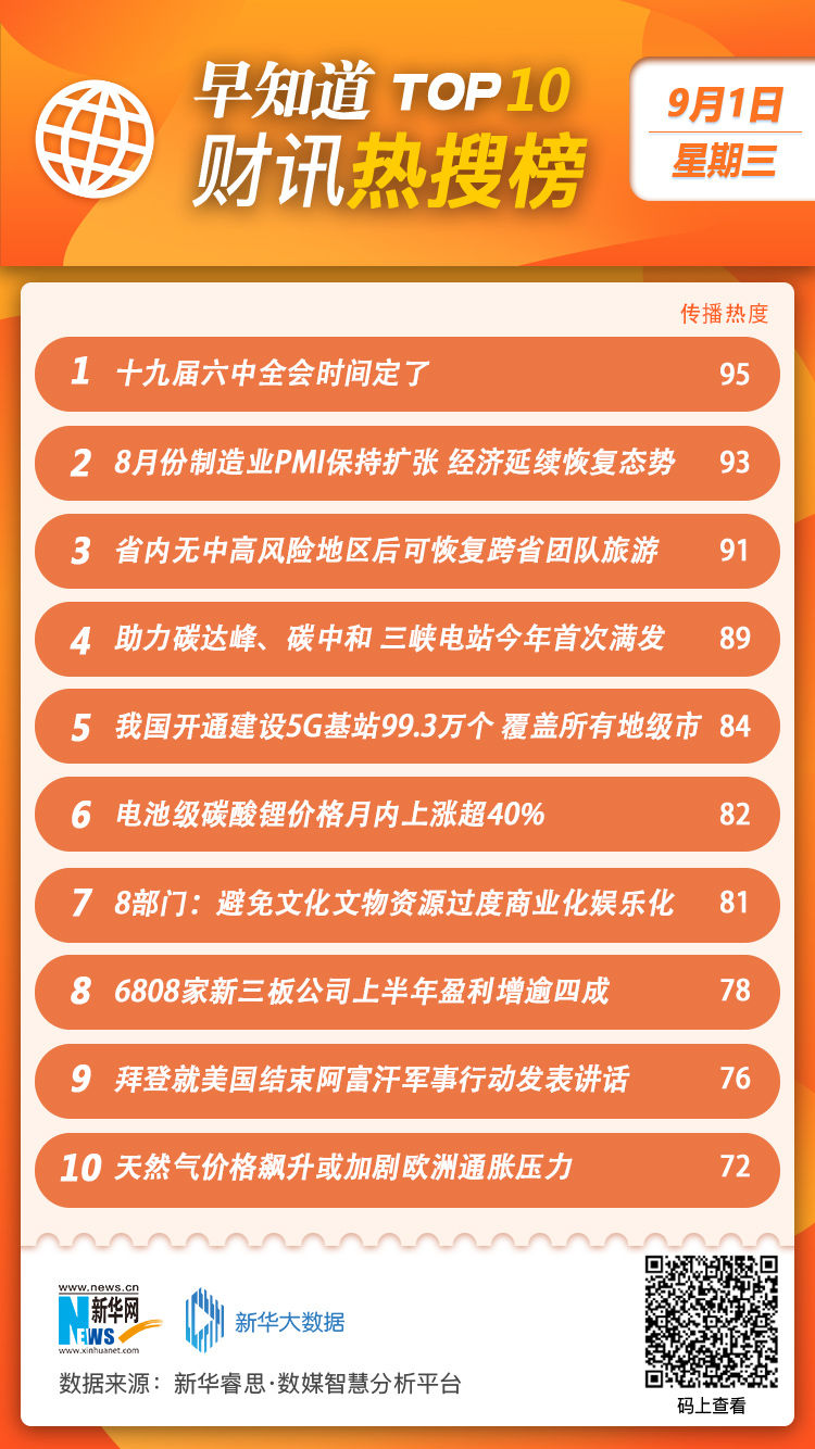 【早知道·财讯热搜榜TOP10】运用新华睿思大数据平台,从各媒体信源数据抓取最近24小时财经新闻、事件、话题传播热度排行。