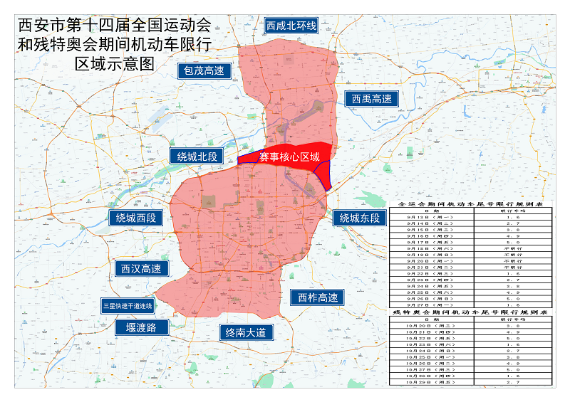 (一)普通限行区域:在西安市现行工作日尾号限行区域【以西安市绕城高速以内区域为中心,向南扩展至终南大道、堰渡路、三星快速干道(不含路)连线以北,西汉高速以东,西柞高速以西围合区域;向北扩展至西咸北环线(不含路)以南、包茂高速以东、西禹高速以西围合区域】的基础上,增加西安市绕城高速公路全段(含路)。