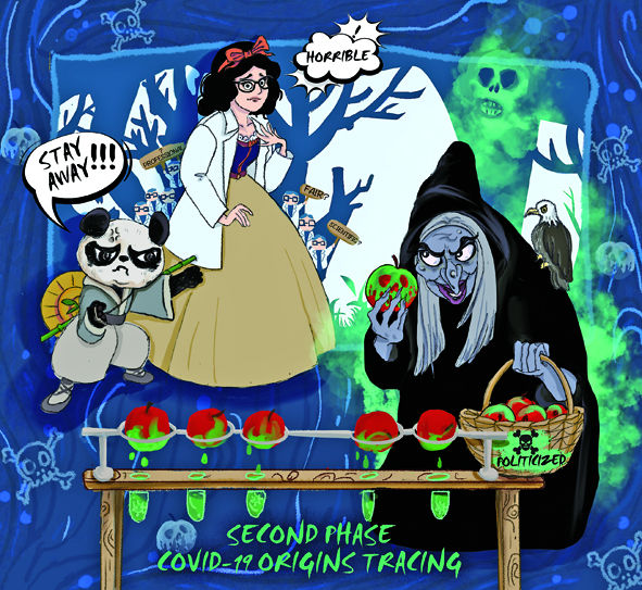 《新白雪公主故事》中,白雪公主化身科学家,经典的服装外又套上了一件白大褂,还戴上了一副眼镜。她身边坚持“科学、专业和公平”的功夫熊猫也加入进来,让白雪公主能够远离这被政治“毒化”的苹果。