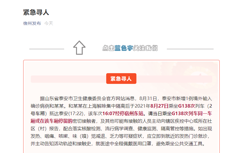 据山东省泰安市卫生健康委员会官方网站消息,8月30日,泰安市新增1例境外输入确诊病例和某某。据宿州发布微信公众号消息,和某某在上海解除集中隔离后于2021年8月27日乘坐G138次列车(2号车厢)抵达泰安(17:22)。