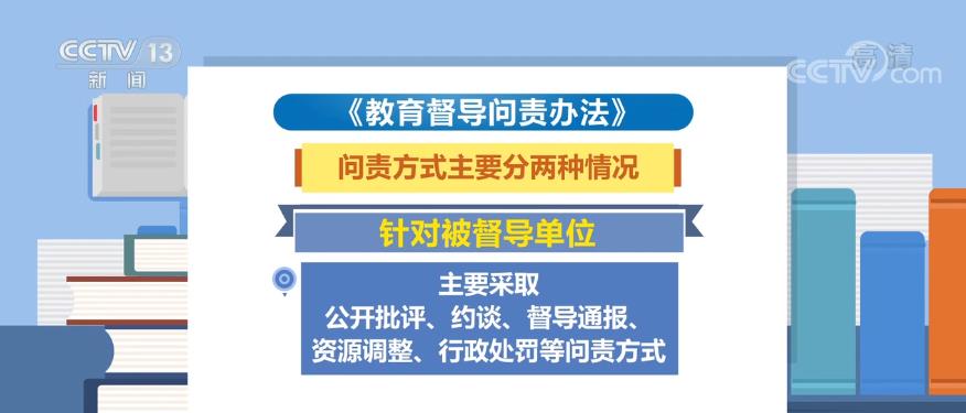 《问责办法》明确了问责方式主要分两种情况。针对被督导单位,主要采取公开批评、约谈、督导通报、资源调整、行政处罚等问责方式。针对责任人,主要采取责令检查、约谈、通报批评、组织处理、处分、移交监察机关或司法机关等问责方式。针对民办学校和教育培训机构责任人,还可采取依法罚没违法所得、从业禁止、纳入诚信记录等问责方式。