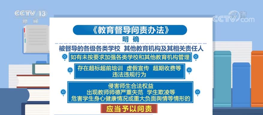 《问责办法》明确被督导的各级各类学校、其他教育机构及其相关责任人,如有未按要求加强各类学校和其他教育机构管理,存在超标超前培训、虚假宣传、超期收费等违法违规行为,侵害师生合法权益,出现教师师德严重失范、学生欺凌等危害学生身心健康情况或重大负面舆情等情形的,应当予以问责。