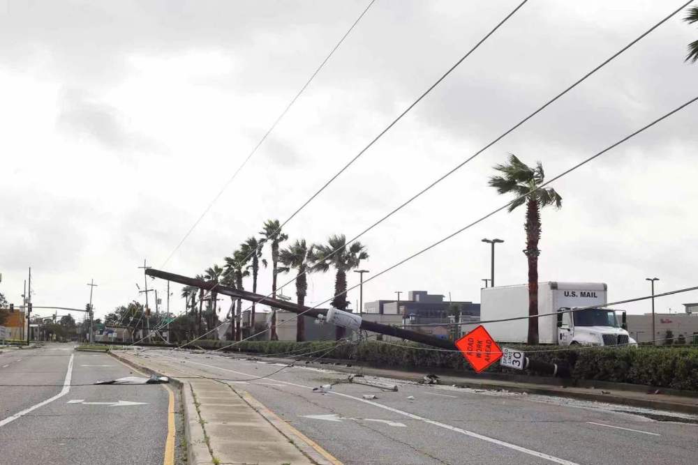 这是8月30日在美国路易斯安那州新奥尔良市郊拍摄的被飓风损坏的电线杆。(新华社发,魏兰摄)