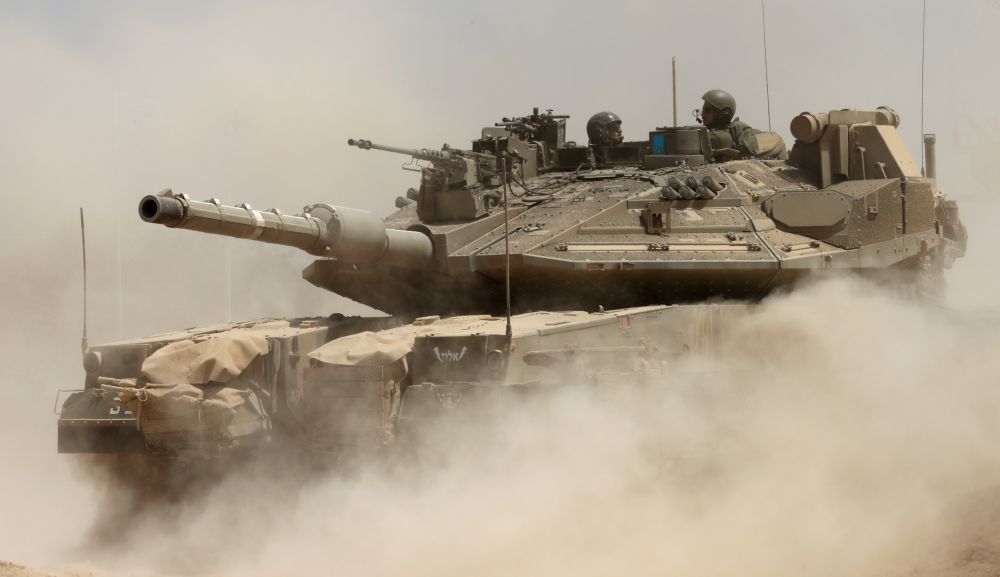 这是8月25日在靠近加沙地带北部边境的以色列斯代罗特拍摄的以色列士兵和坦克。(新华社发,吉尔·科恩·马根摄)