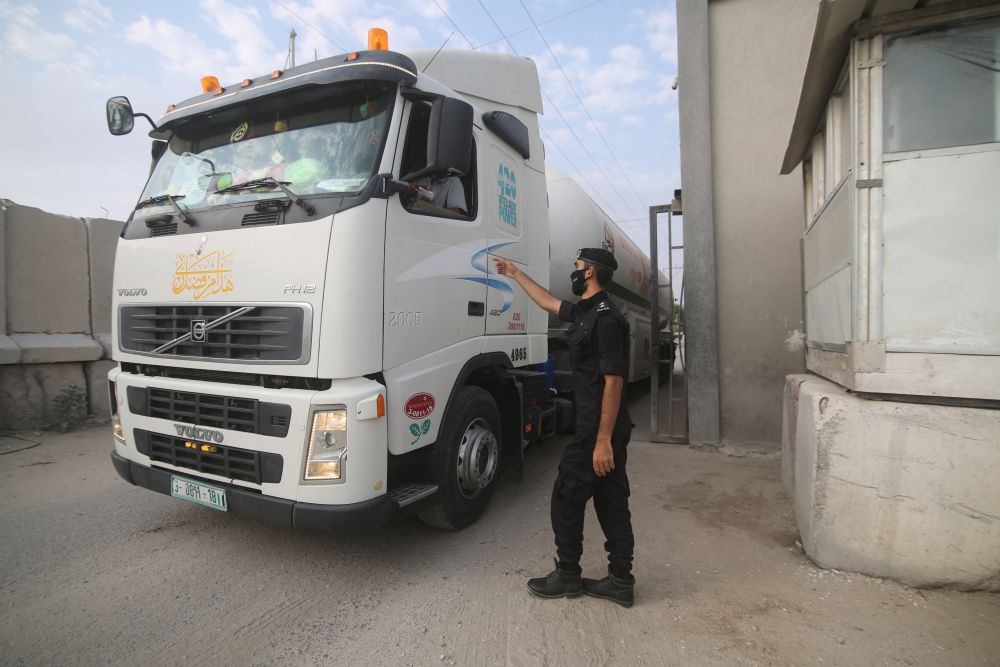 9月1日,在加沙地带,一辆卡车通过凯雷姆沙洛姆口岸。(新华社发,哈立德·奥马尔摄)