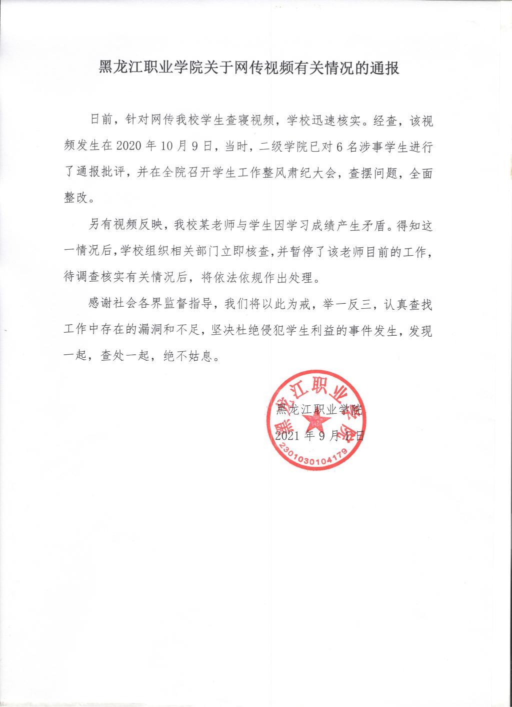 黑龙江职业学院对学生查寝视频回应:已对6名学生通报批评