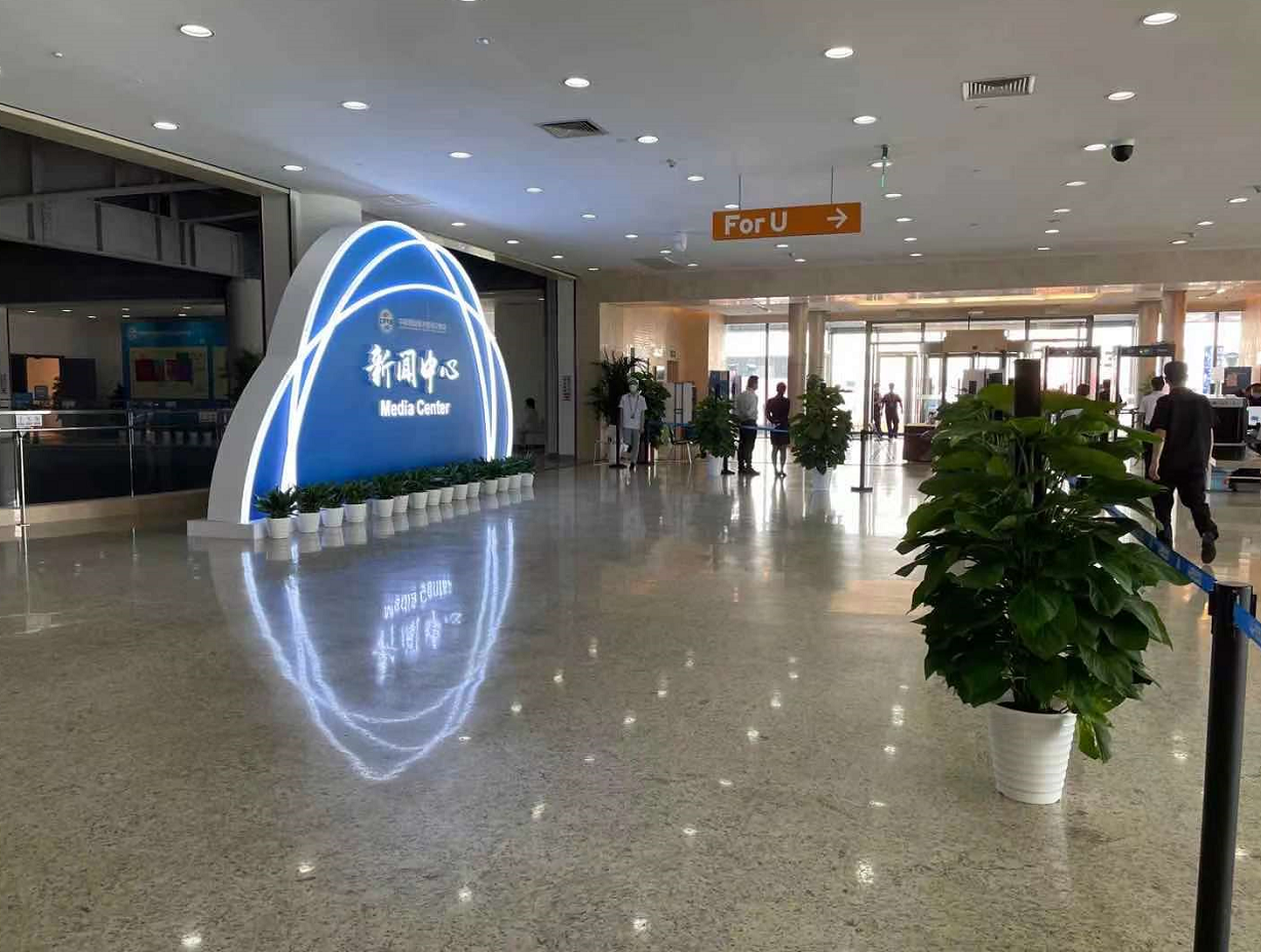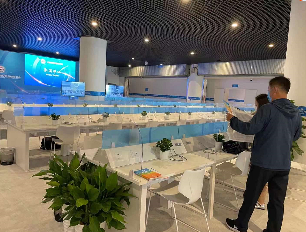 据介绍,新闻中心搭建全部选用环保材料,会场布置景观绿植,为媒体打造一个简洁明快、干净清新的办公环境。目前,整个新闻中心已实现移动终端5G网络全覆盖。
