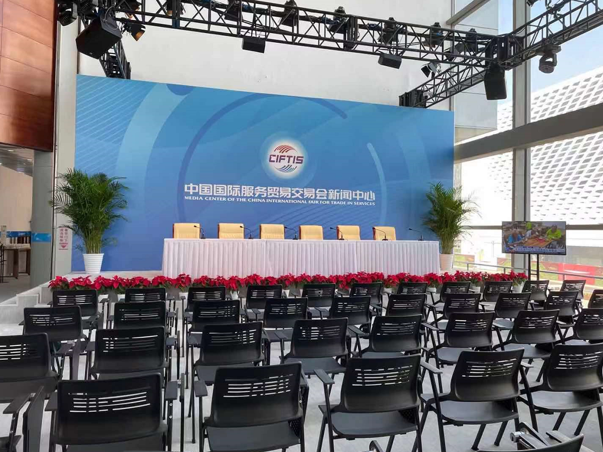 此次,新闻发布区设置在二楼,这里可容纳七十余人,将密集发布服贸会相关资讯。在防控疫情方面,新闻发布厅配备紫外线臭氧消毒设备,发布会召开前,将对鹅颈麦、话筒、音频耳机等设备在使用前提前进行消毒防护。针对共享共用设备,每次使用结束后,及时对设备控制面板、手柄、设备按钮等人员接触部位和发布厅桌椅进行环境消毒,确保设备使用安全,从严从细做好疫情防控。
