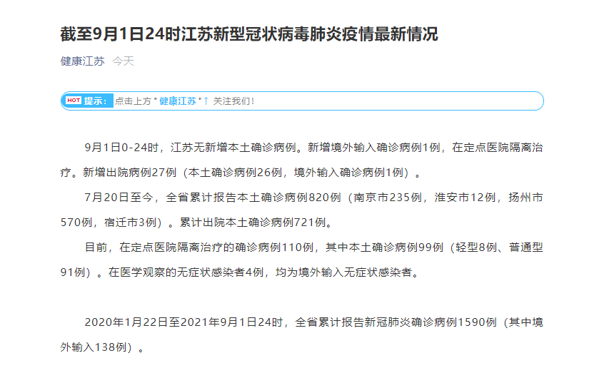江苏省卫健委9月2日通报:9月1日0—24时,江苏无新增本土确诊病例。新增境外输入确诊病例1例,在定点医院隔离治疗。新增出院病例27例(本土确诊病例26例,境外输入确诊病例1例)。