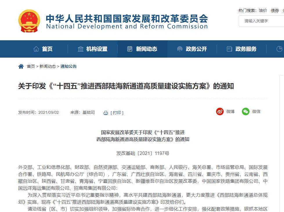 国家发改委印发《“十四五”推进西部陆海新通道高质量建设实施方案》