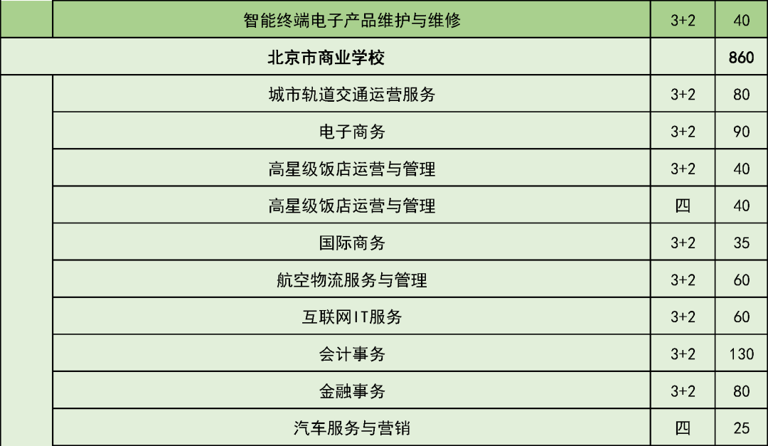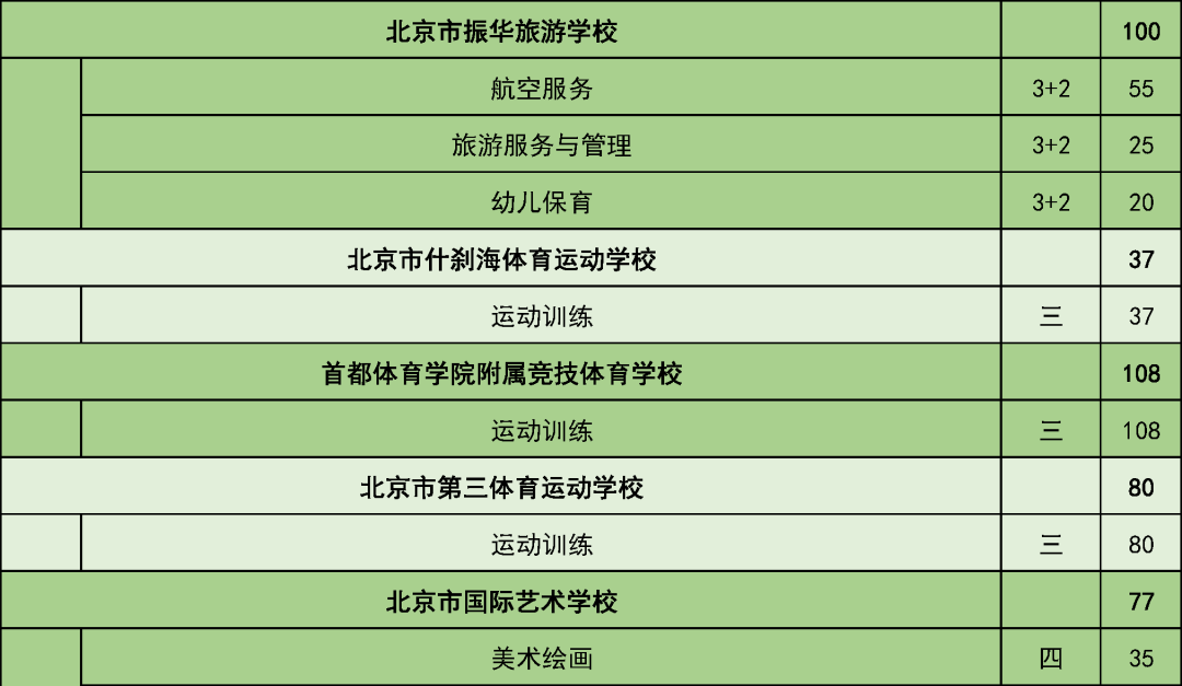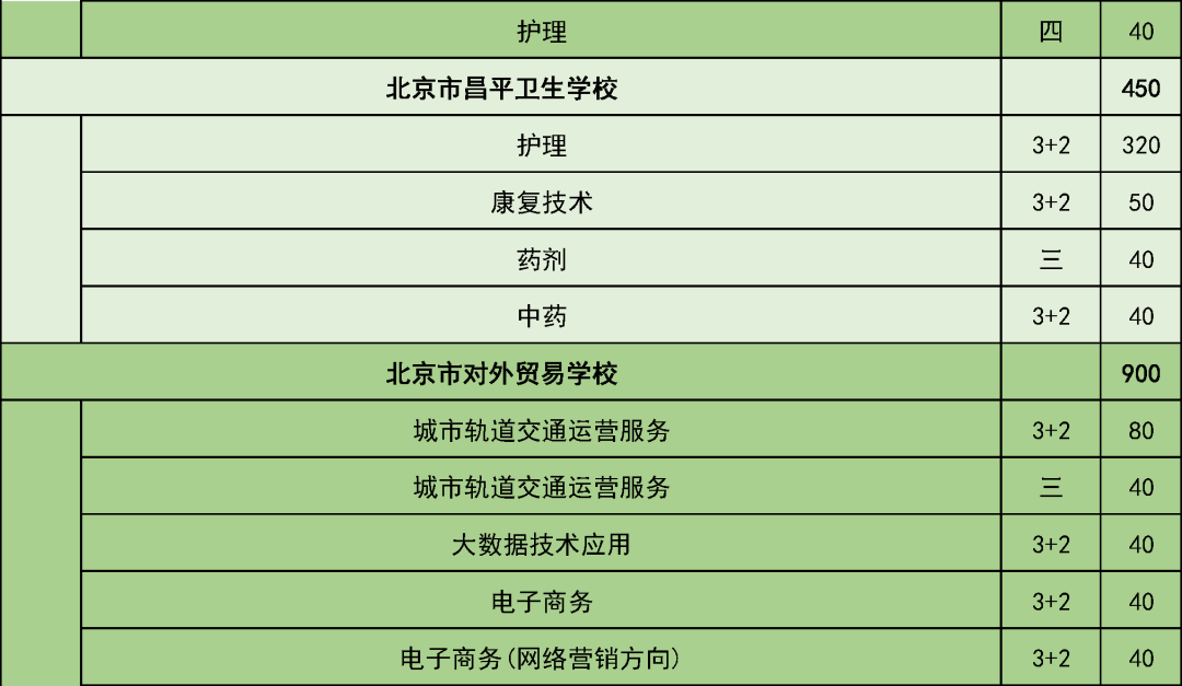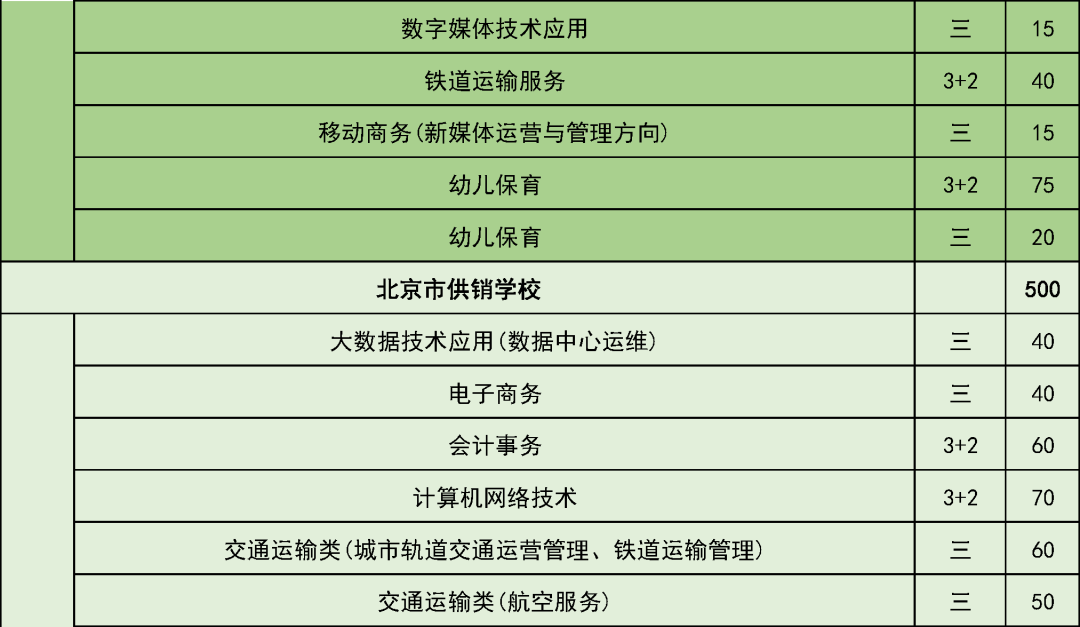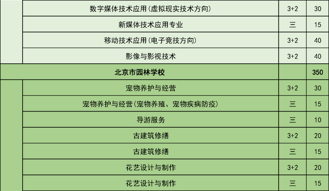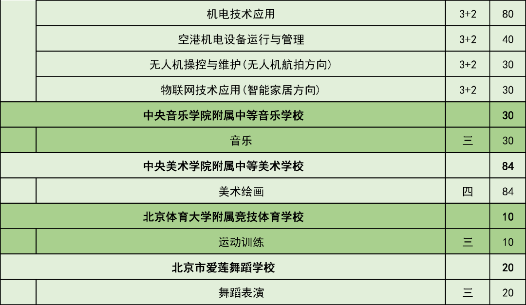 根据安排,今年北京市普通中等专业学校在京招生8474人、京外招生1150人;五年制高职试点学校共招1660人;高端技术技能人才贯通培养学校招生2810人。