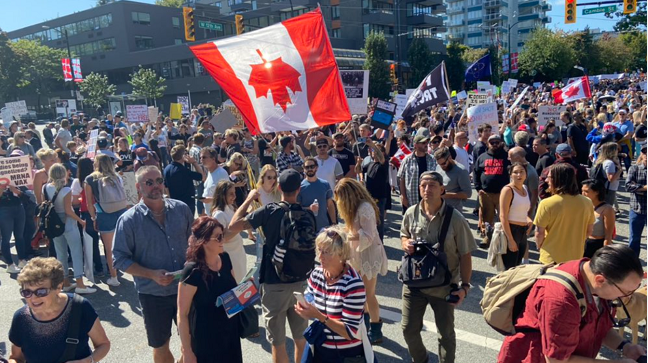 △9月1日在温哥华的反对戴口罩和强制接种疫苗的抗议活动