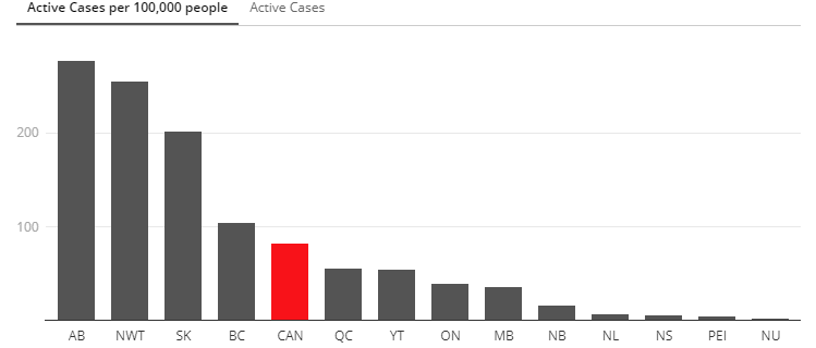 △加拿大各省每十万人口中的现存新冠肺炎确诊病例对照图(红色为加拿大全国平均值)