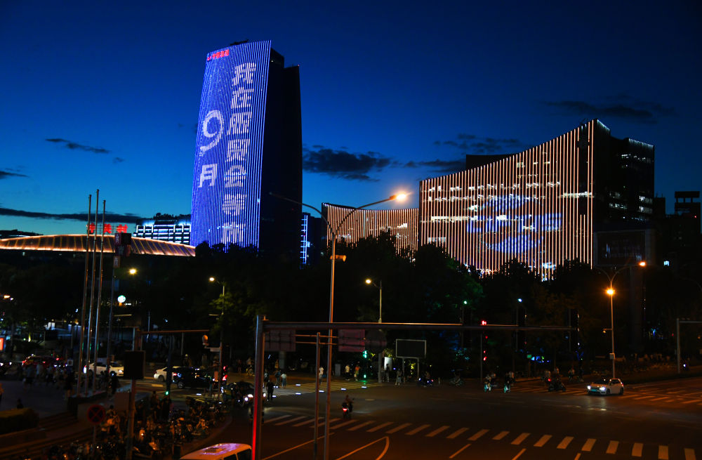 这是8月1日在北京市海淀区中关村大街拍摄的2021年服贸会户外灯光展示。新华社记者 任超 摄