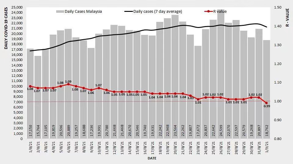 报道说,根据马来西亚卫生部总监丹努尔·希沙姆发布在社交媒体上的图表显示,马来西亚全国新冠病毒基本传染数8月份都在1.01至1.09之间徘徊。迈入9月后,新冠病毒基本传染数也随单日新增确诊病例数一起下降。新冠病毒基本传染数低于1.0的地区有雪兰莪州(0.92)、普特拉贾亚(0.91)、马六甲(0.90)、吉隆坡和森美兰州(皆0.81)。