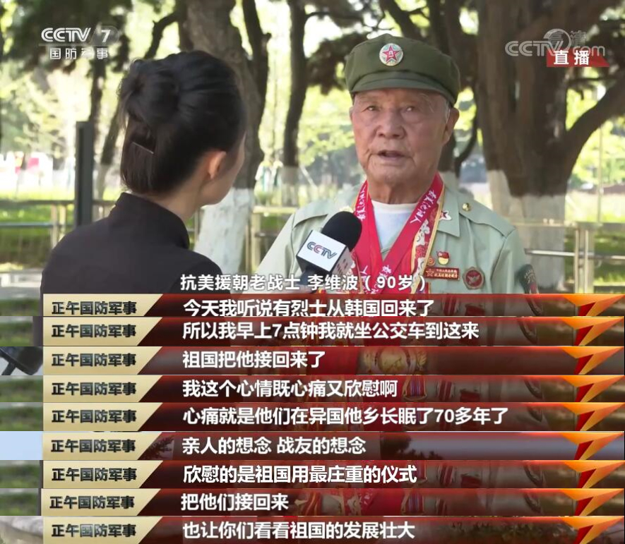 今天上午11时25分,运-20抵达沈阳桃仙国际机场后,机场方面用民航界的最高级别礼仪“过水门”迎接祖国的英雄儿女回家!同时,2架护航的歼-11B低空拉烟,向烈士致以最崇高的敬意。在迎回仪式现场,约800名各界代表正在静静地等待,他们中有抗美援朝烈士家属,有来自陆军、空军、火箭军和武警部队的官兵代表等等。