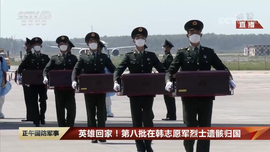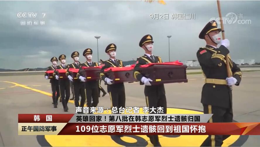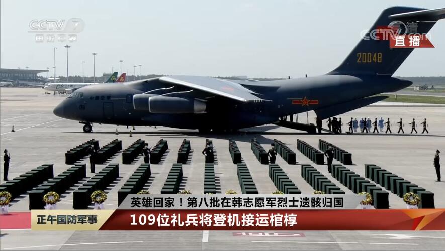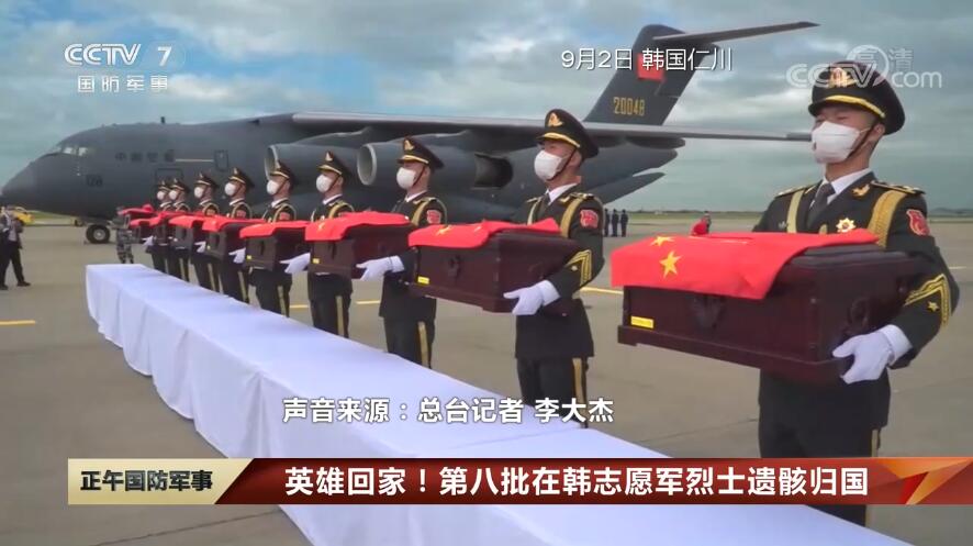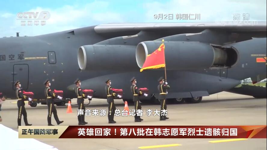 央视网消息:浩气存天地、英烈归故里。英烈,是我们从儿时便熟悉的词语,英烈,是我们从小就学习的榜样。今天(9月2日),第八批在韩中国人民志愿军烈士遗骸归国,我们将以最高礼仪迎接109位英烈回家。70多年前,在那段抗美援朝战争的峥嵘岁月里,他们默默无闻,却让我们屹立于世界;他们走进历史,却让我们拥抱未来;他们失去生命,却让我们生生不息。今天,第八批在韩中国人民志愿军烈士遗骸及相关遗物回到祖国的土地。中韩双方在韩国仁川国际机场举行交接仪式后,烈士遗骸及遗物由中国空军运输机运-20接运回国。