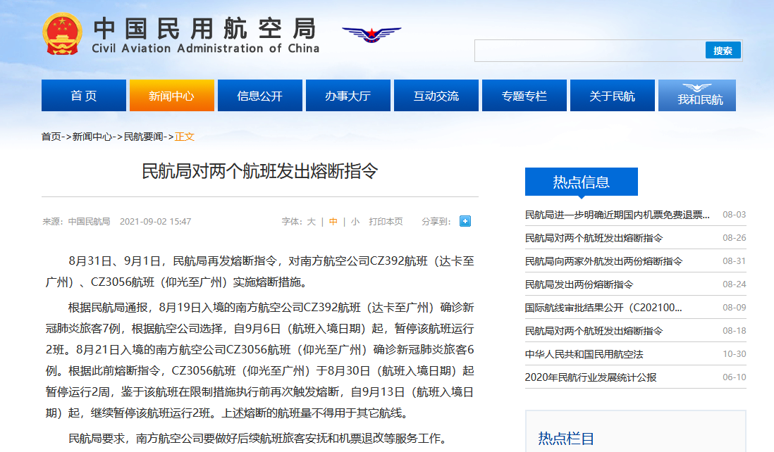 根据民航局通报,8月19日入境的南方航空公司CZ392航班(达卡至广州)确诊新冠肺炎旅客7例,根据航空公司选择,自9月6日(航班入境日期)起,暂停该航班运行2班。8月21日入境的南方航空公司CZ3056航班(仰光至广州)确诊新冠肺炎旅客6例。根据此前熔断指令,CZ3056航班(仰光至广州)于8月30日(航班入境日期)起暂停运行2周,鉴于该航班在限制措施执行前再次触发熔断,自9月13日(航班入境日期)起,继续暂停该航班运行2班。上述熔断的航班量不得用于其它航线。