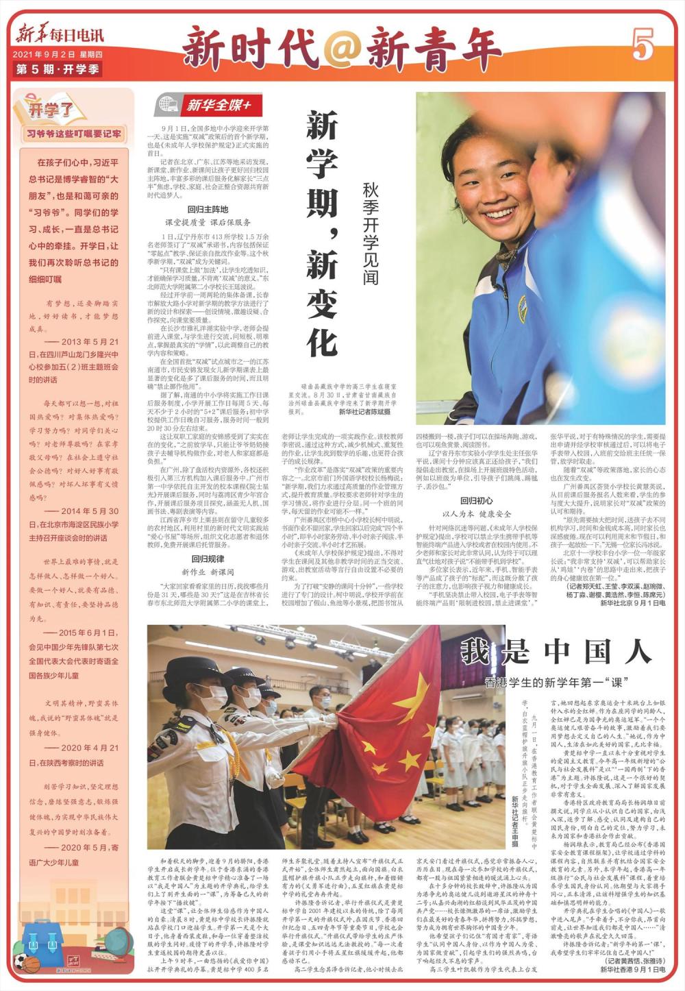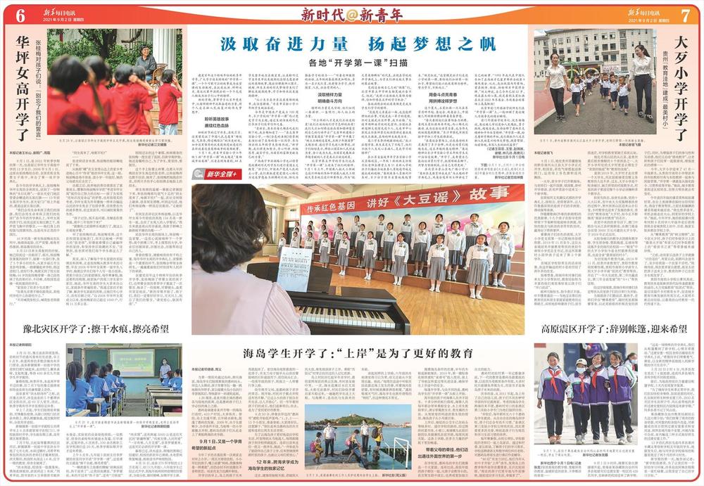 【编者按】9月1日,全国多地中小学迎来开学第一天。这是实施“双减”政策后的首个新学期,也是《未成年人学校保护规定》正式实施的首日。9月2日,《新华每日电讯》副刊部与融媒中心联合推出第5期《新青年@新时代》青春特刊,讲述新学期与新同学的故事!