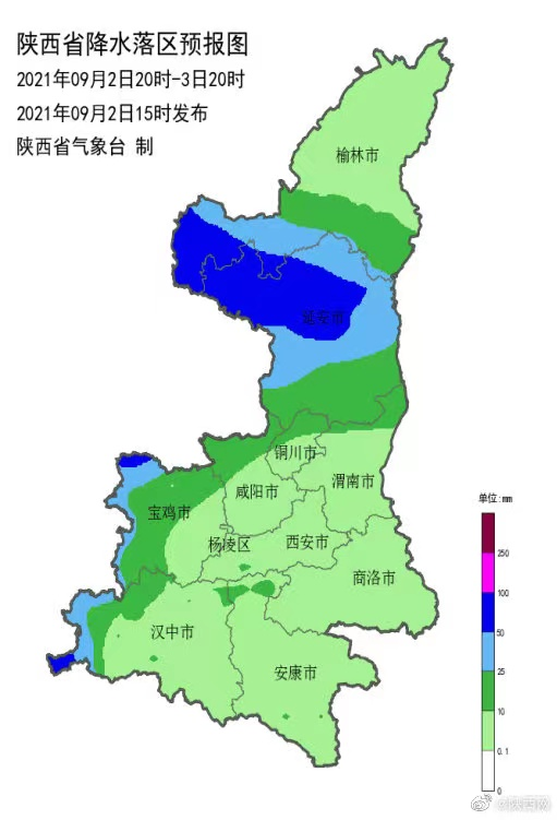 陕西省气象台2021年9月2日下午发布暴雨蓝色预警:受高空槽和副高外围暖湿气流共同影响,预计9月2日20时至9月3日20时,陕北中西部、宝鸡西部部分、汉中西部部分地方有大雨(20~45毫米),其中定边、靖边、吴起、志丹、安塞、宝塔区、甘泉、延川、陇县、宁强等县区局地有暴雨(50~80毫米),过程期间伴有短时暴雨,最大小时雨强20~40毫米,局地可超过50毫米,上述地区的相邻县区也需高度关注。强降水影响区域易出现滑坡、泥石流、崩塌等地质灾害,山洪和中小河流洪水气象风险等级高,请做好应急准备工作,关注当地预警信号和短临预报,适时采取应急措施。