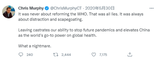 △当时的民主党籍参议员克里斯·墨菲曾说,“特朗普政府从来都不是为了推动世卫组织改革。那都是谎言。它就是为了转移(对总统抗疫不利的指责)以及寻找替罪羊”。这一表态当时代表了民主党内的主流意见。