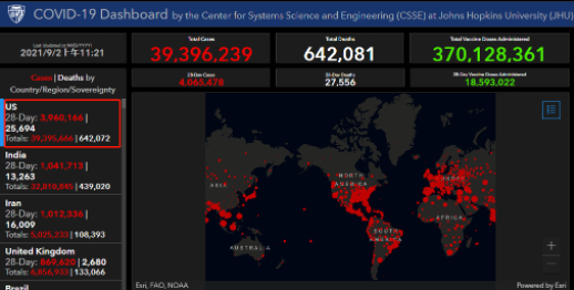 △美国约翰斯·霍普金斯大学实时数据显示,截至北京时间9月2日上午,美国新冠肺炎累计确诊病例已超3939万,眼看又逼近了下一个千万级心理关口。