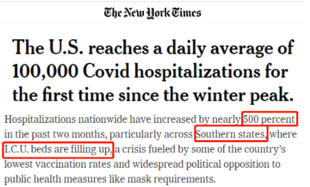 佩戴口罩、减少聚集等基本防疫措施同样遭遇着强力抵制。过去两个月,全美新冠肺炎住院人数激增近500%,尤其是在共和党人把持的南部各州,重症监护床位已接近满员。