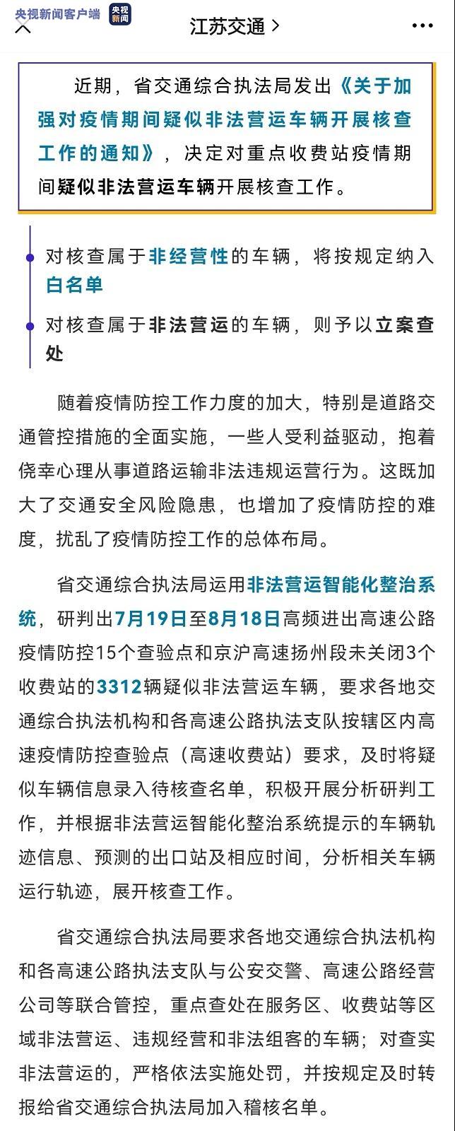 江苏省交通综合执法局发出《关于加强对疫情期间疑似非法营运车辆开展核查工作的通知》,决定对重点收费站疫情期间疑似非法营运车辆开展核查工作。对核查属于非经营性的车辆,将按规定纳入白名单;对核查属于非法营运的车辆,则予以立案查处。