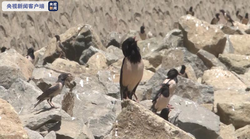 在伊宁县托乎拉苏草原一处道路建设工地,这里听不到大型机械的轰鸣,也见不到工人繁忙劳动场景。走进项目现场,一片叽叽喳喳的鸟叫声,还堆积着许多用于修葺边坡的石头,上面聚集了很多粉红椋鸟。