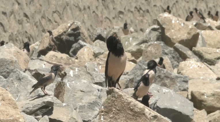 在伊宁县托乎拉苏草原一处道路建设工地,听不到大型机械的轰鸣,也见不到工人繁忙劳动场景,走进项目现场,一片叽叽喳喳的鸟叫声,现场堆积着许多用于修葺边坡的石头,上面聚集了很多粉红椋鸟,它们时而上飞舞,时而盘旋嬉戏,时而俯冲掠食,附近路过的车辆也会减速行驶,以免惊吓到这些鸟儿。