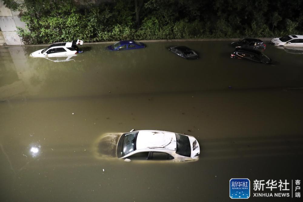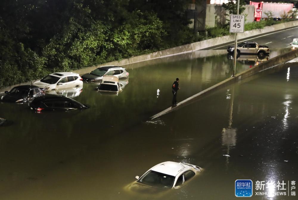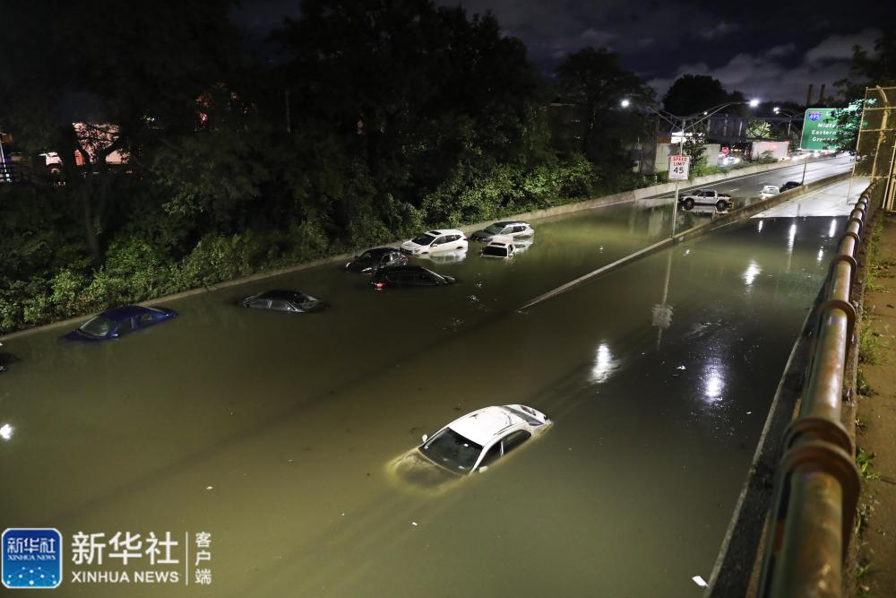 ↑9月2日,美国纽约一条主要道路上的车辆被积水淹没。