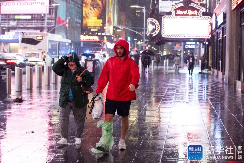 ↑9月2日,人们冒雨走在美国纽约时报广场上。