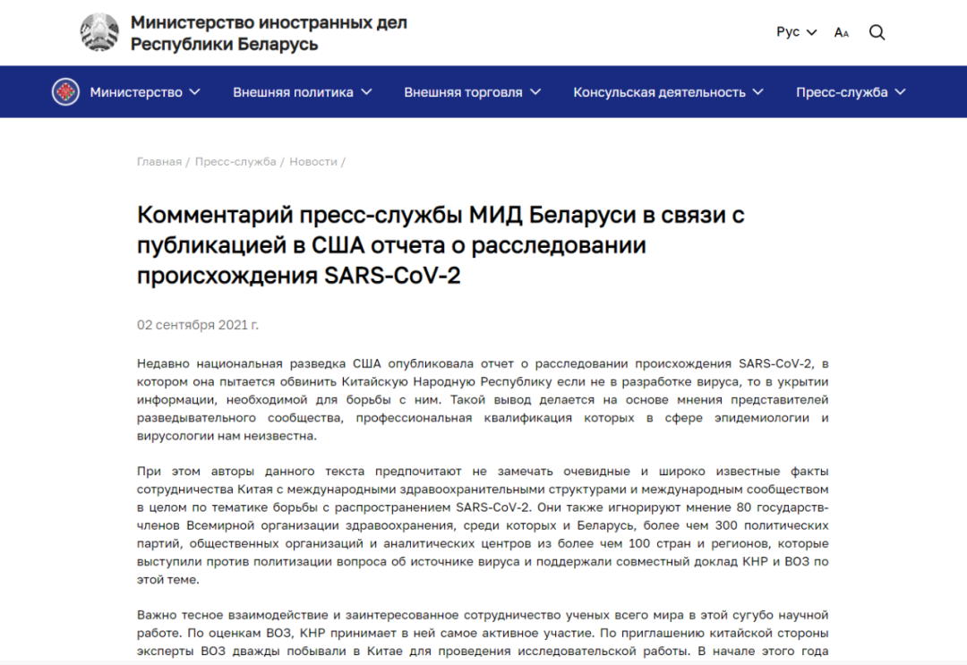 当地时间9月2日,白俄罗斯外交部就美国情报机构发布所谓新冠病毒溯源调查报告发表评论。
