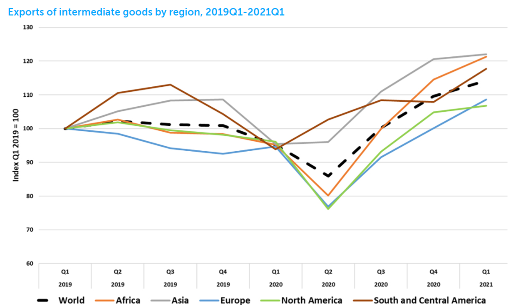 今年一季度,全球中间产品出口同比增长20%,其中亚洲增速最快,受益于中国工业中间产品出口增长41%,主要涉及信息通信技术设备和光伏电池部件。