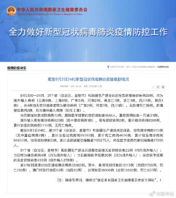 截至9月2日24时,据31个省(自治区、直辖市)和新疆生产建设兵团报告,现有确诊病例935例(其中重症病例2例),累计治愈出院病例89383例,累计死亡病例4636例,累计报告确诊病例94954例,现有疑似病例2例。累计追踪到密切接触者1165275人,尚在医学观察的密切接触者17000人。