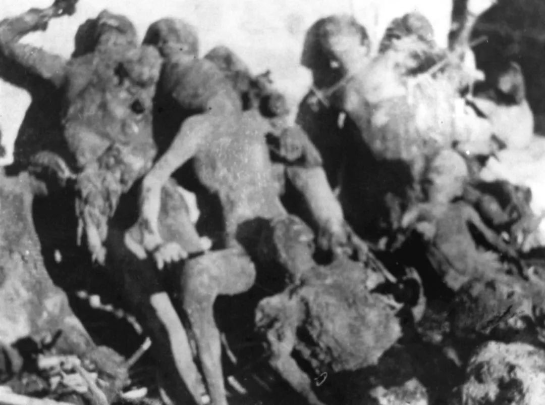1941年1月25日,日军血洗了河北省丰润县潘家峪,杀死中国平民1230人,制造了骇人听闻的“潘家峪惨案”。被日本侵略军杀害的潘家峪老百姓的尸体。新华社发