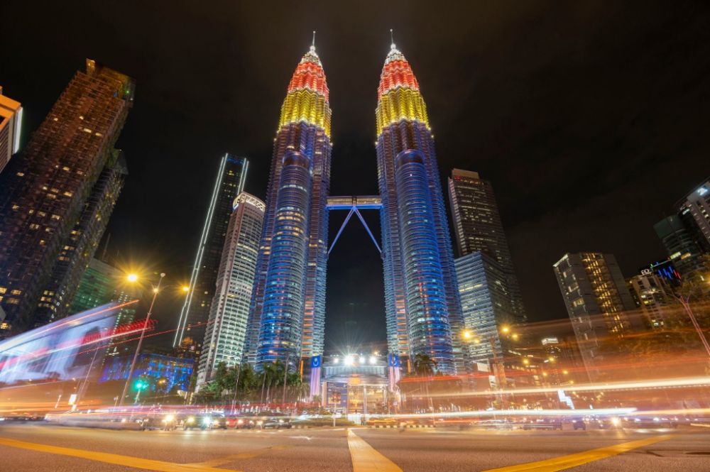 8月31日,位于吉隆坡的马来西亚国家石油公司双塔亮起马来西亚国旗颜色的灯光,庆祝马来西亚独立64周年。(新华社发,张纹综摄)