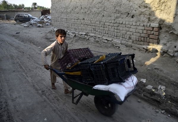 8月28日,一名阿富汗难民儿童在巴基斯坦白沙瓦的难民营推车前行。 (新华社发,赛义德·艾哈迈德摄)