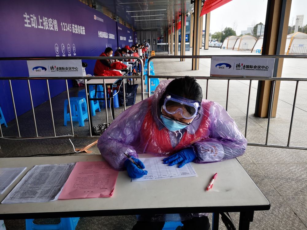 疫情期间在高铁站做志愿者的章宬。(受访者供图)