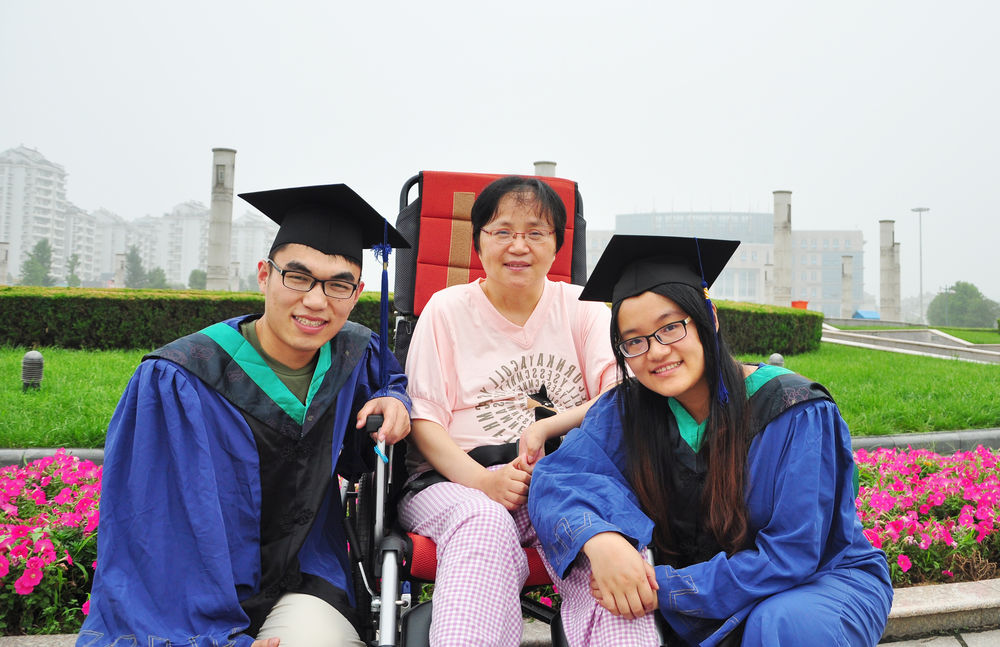 章宬与王开利穿着硕士服与章宬母亲吴小平合影。(受访者供图)