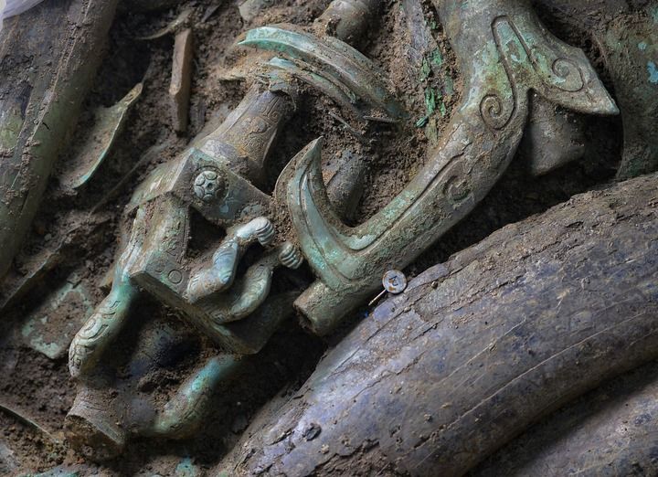 图为在三星堆遗址考古发掘现场三号“祭祀坑”拍摄的青铜器。 新华社记者 刘坤 摄