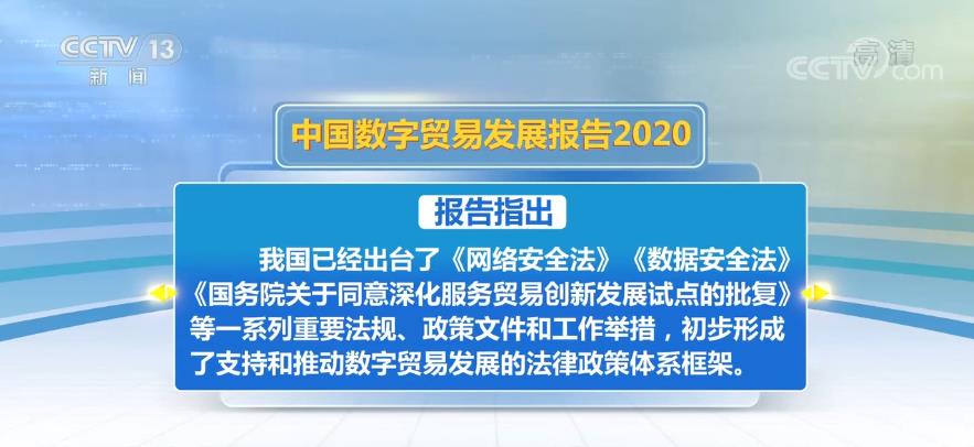报告指出,我国已经出台了《网络安全法》《数据安全法》《国务院关于同意深化服务贸易创新发展试点的批复》等一系列重要法规、政策文件和工作举措,初步形成了支持和推动数字贸易发展的法律政策体系框架。