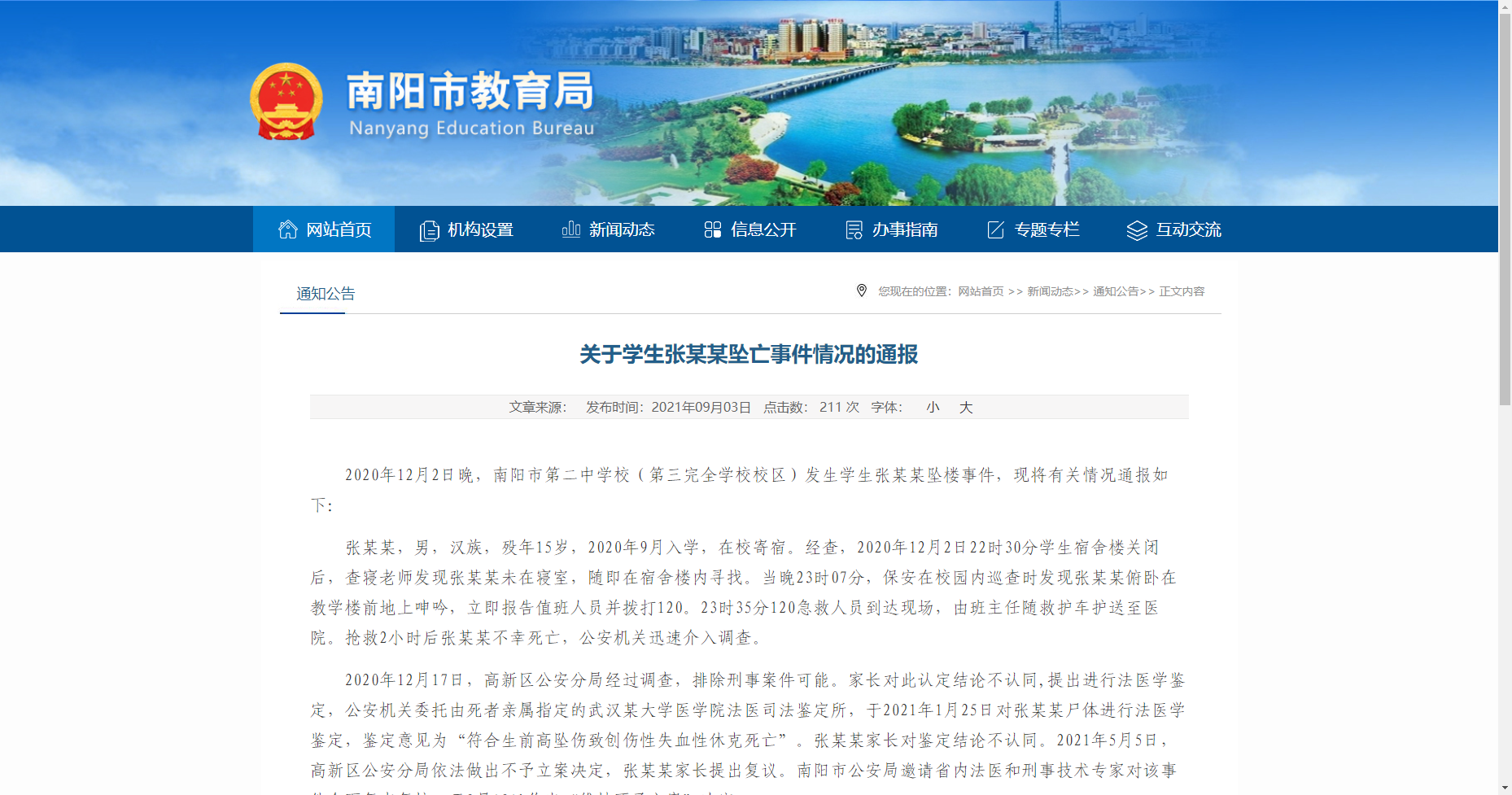 2020年12月2日晚,南阳市第二中学校(第三完全学校校区)发生学生张某某坠楼事件,现将有关情况通报如下: