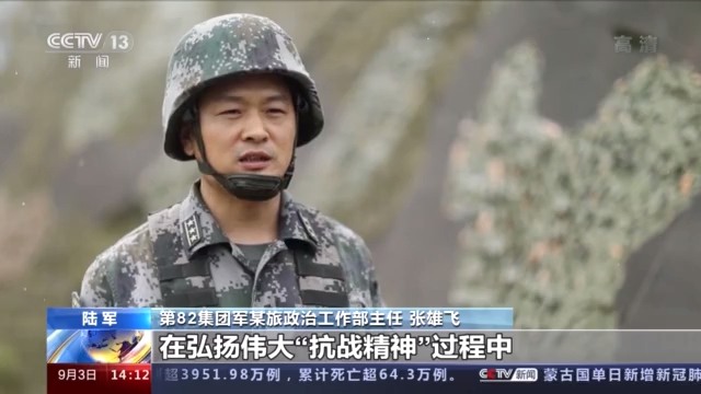第82集团军某旅政治工作部主任 张雄飞:我们开展这次纪念活动,就是要引导官兵在弘扬伟大“抗战精神”过程中,激发血性胆气、强化使命担当,不断增强忧患意识、危机意识和打仗意识,以时不我待、只争朝夕的紧迫感聚力练兵备战。