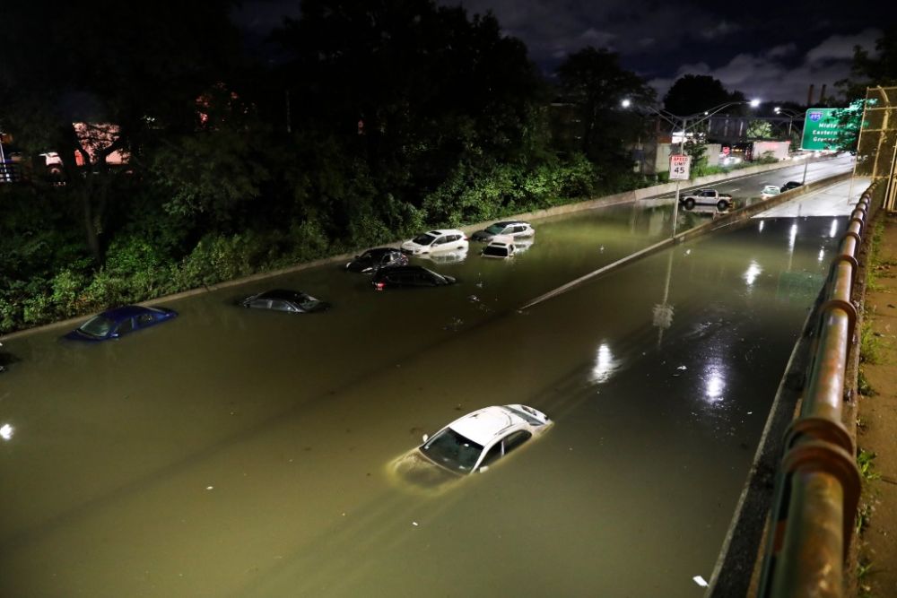 在纽约市,近500辆汽车被遗弃在洪水淹没的高速公路上,大水涌入城市地铁隧道,至少17列列车被困,服务全天中断。发布至网上的视频显示,乘客站在被淹没的车厢座位上。这些乘客随后被疏散。