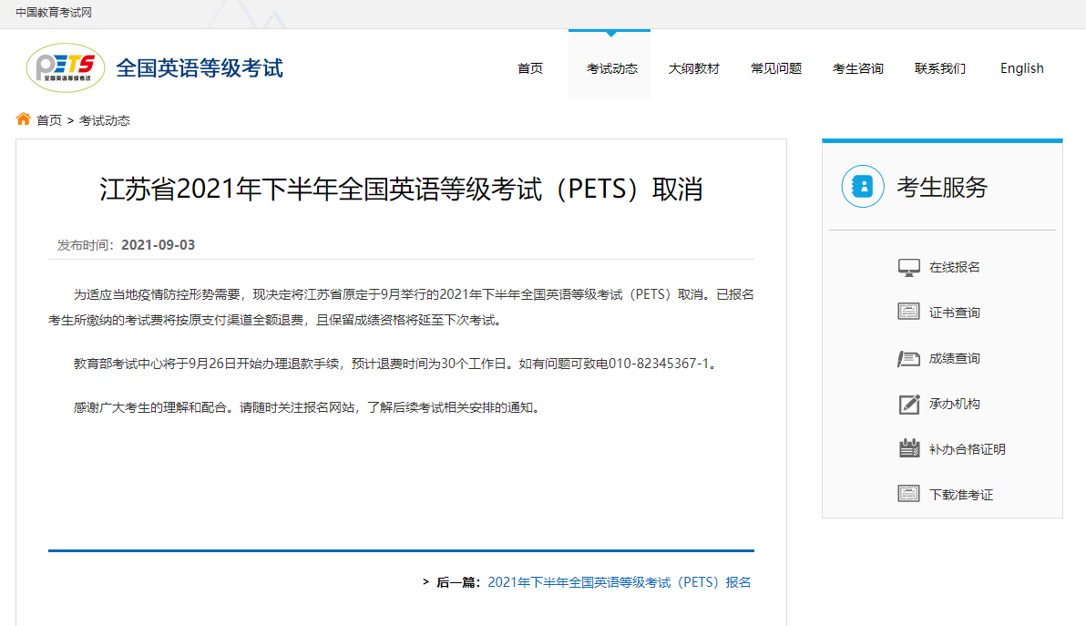央视网消息:据中国教育考试网消息,为适应当地疫情防控形势需要,现决定将江苏省原定于9月举行的2021年下半年全国英语等级考试(PETS)取消。已报名考生所缴纳的考试费将按原支付渠道全额退费,且保留成绩资格将延至下次考试。