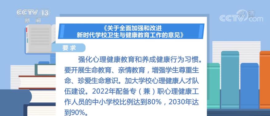 《意见》还要求,强化心理健康教育和养成健康行为习惯。要开展生命教育、亲情教育,增强学生尊重生命、珍爱生命意识。加大学校心理健康人才队伍建设。2022年配备专(兼)职心理健康工作人员的中小学校比例达到80%,2030年达到90%。